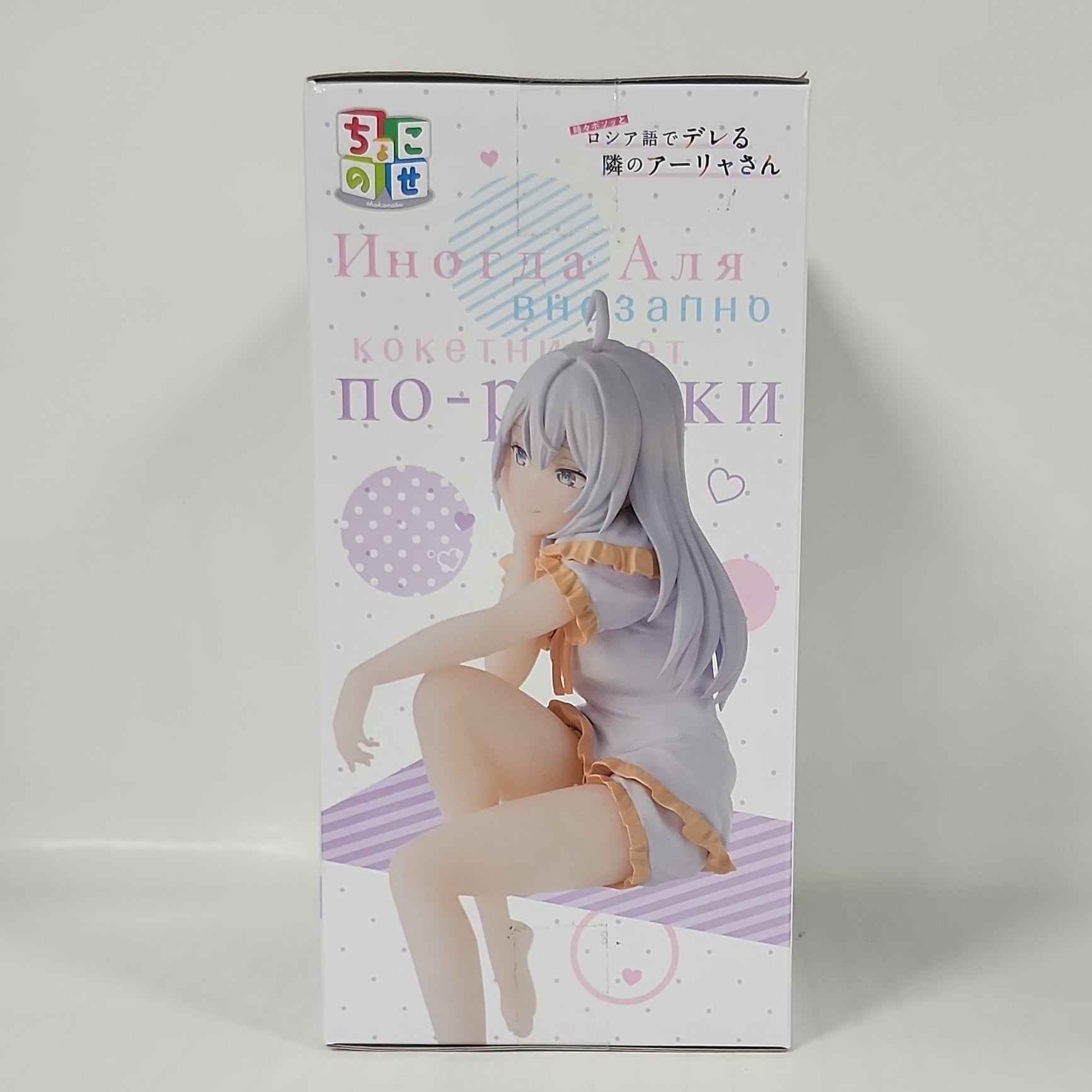 Dressed in a frilled lounge outfit with gentle pastel tones, Alya sits gracefully with her long silver hair flowing naturally and her signature ahoge adding a playful accent. Her shy smile and relaxed posture perfectly capture the quiet, teasing moments fans love from the series.